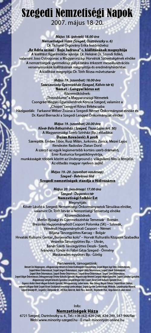 | SZNN_2007 | 121 | | Program Dní segedínskych národností v r. 2007 [hu] (18-20.05.2007) | 18.05.2007 |